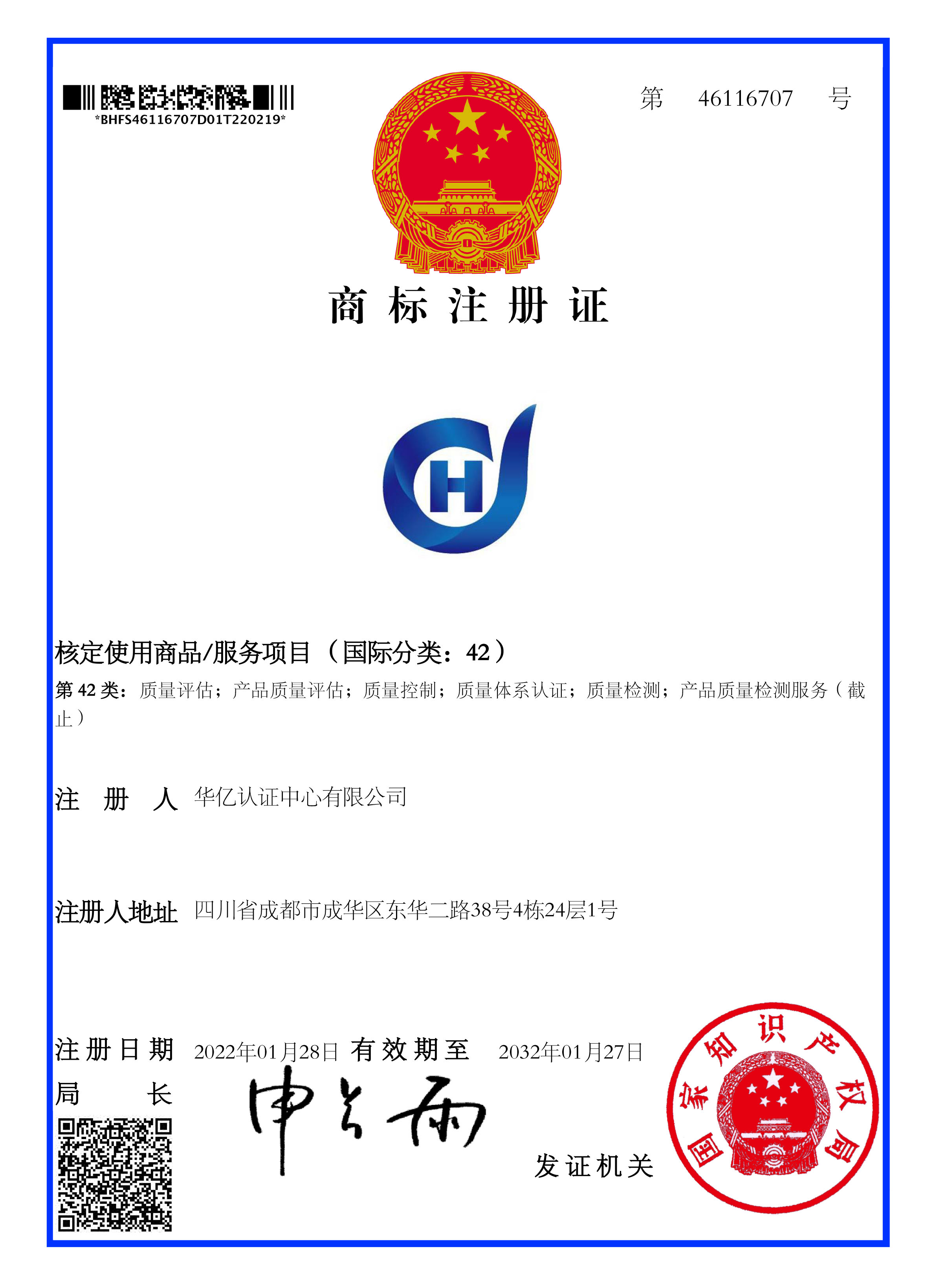 华亿商标注册证